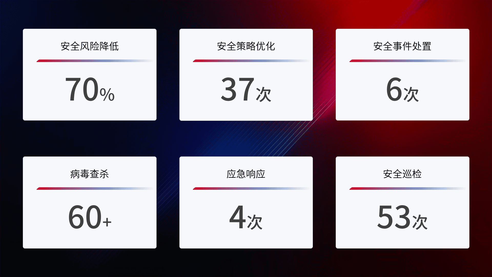 提供全面的安全事件报告体系,,,,包括处置报告、、、周报、、季度和年度总结,,,,结合持续监控,,帮助客户深入了解网络安全状况。。