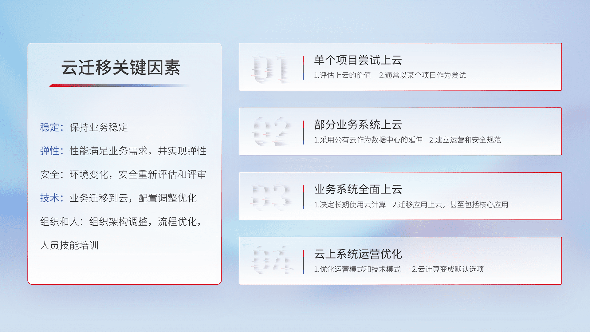 结合实际业务,,,从规划设计、、、、云平台选型、、云原生改造、、、数据迁移、、、、集成交付,,,迁移全过程为客户识别最佳上云路径,,,做好风险识别管理,,,,设计网络架构、、身份权限、、、、安全审计合规、、、、操作审计、、、、日志审计、、、、监控告警策略、、多站点容灾设计等,,对云上基础设施进行整体规划,,,,提升IT治理水平,,,以满足弹性、、高可用、、、、高性能的需求。。。。