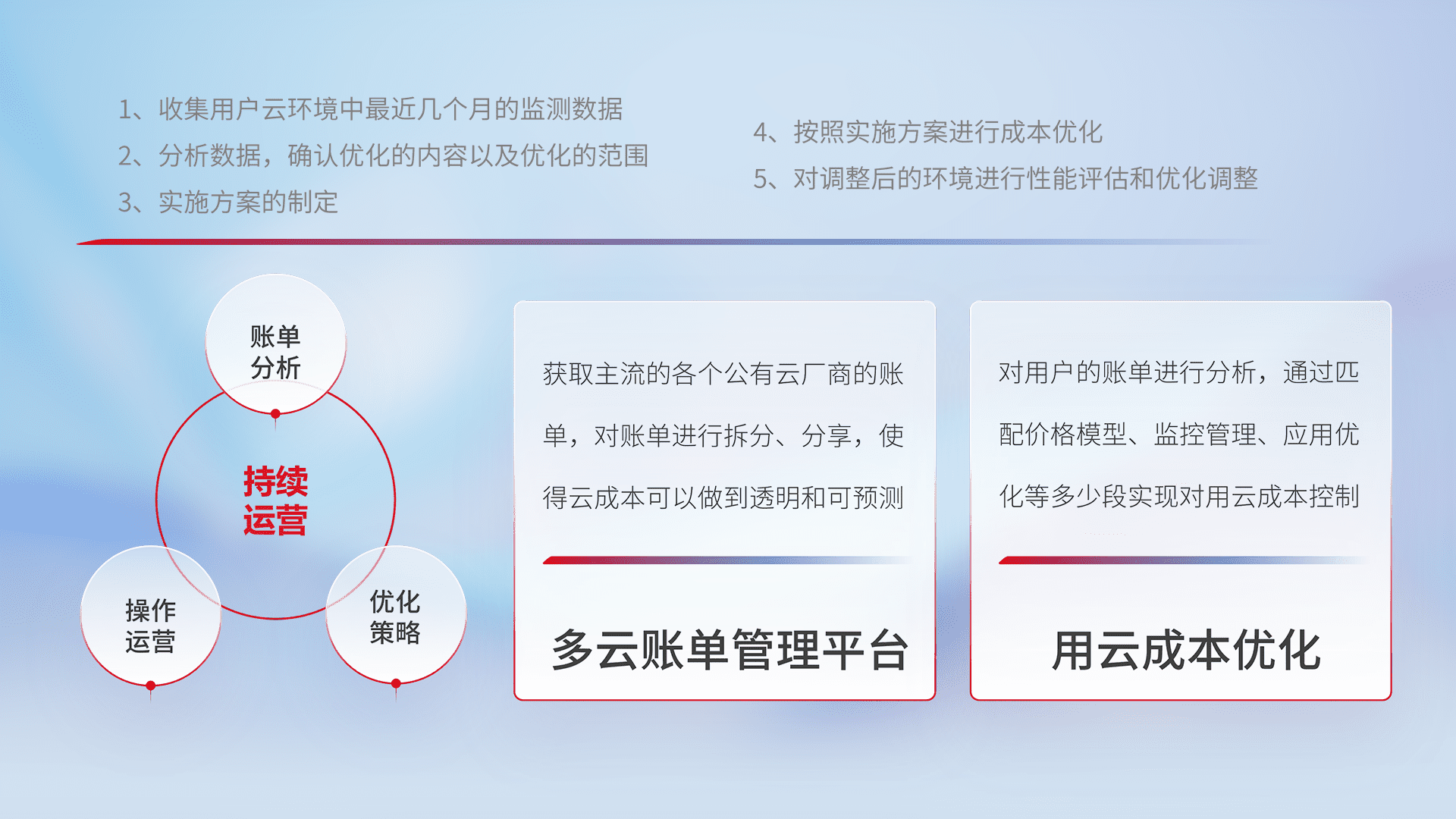通过多云纳管,,以统一的资源数据模型把客户的云资源进行抽象和封装,,进而实现对多云资源的统一操作,,,,保障云资源管理的可靠性、、稳定性与可用性。。。量身定制化运维内容,,,配置、、、开发运维、、、补丁管理、、、、备份、、、监控、、、认证和访问管理、、审计和日常巡检等,,,保障在用云过程中的可靠度,,,稳定度以及高可用率。。。。